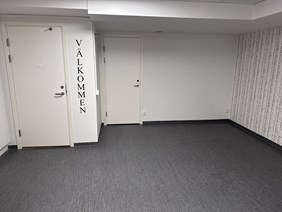 Ett tomt rum med två stängda dörrar, vita väggar, grå heltäckningsmatta och ordet VÄLKOMMEN skrivet vertikalt bredvid den ena dörren.
